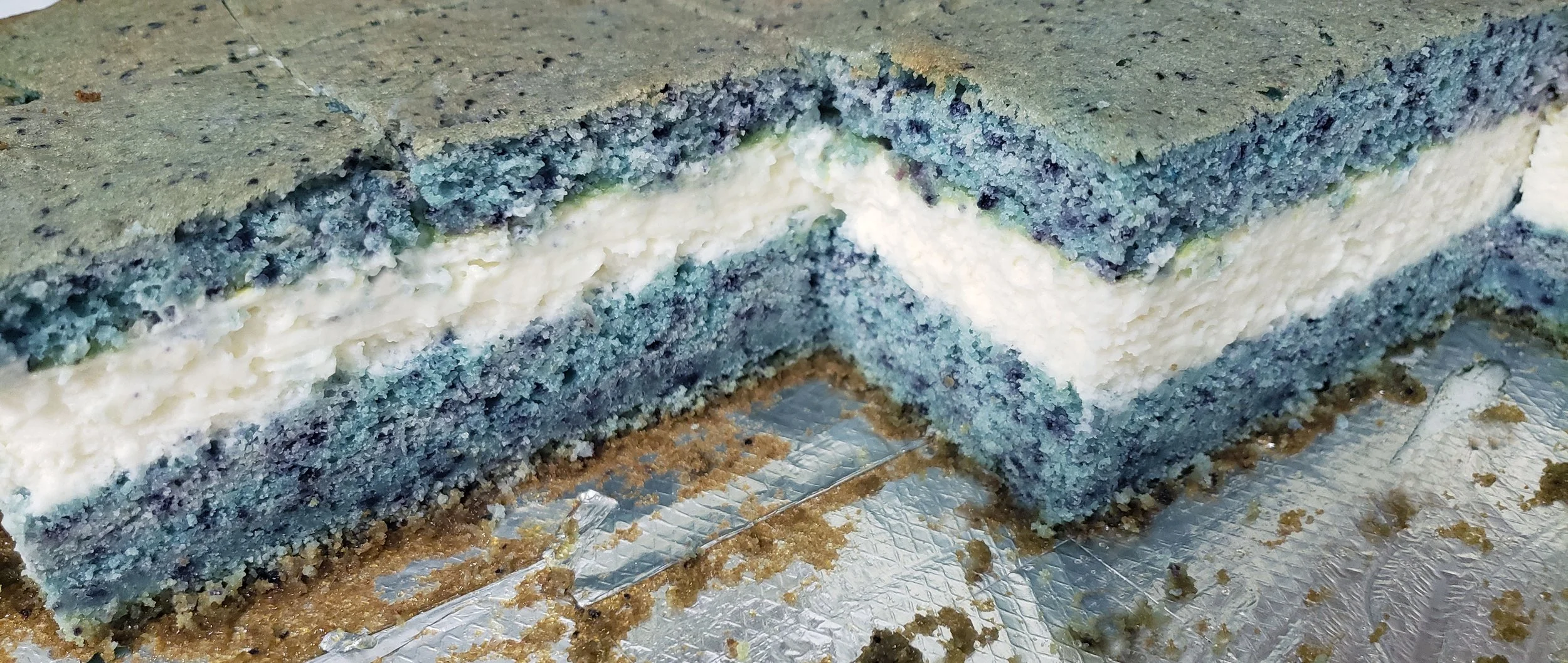 Of course I used food coloring because blueberries are NOT blue - this recipe is full of mistakes so do as I say not as I do! We need to prepare 3 recipes: a blueberry cake, a white chocolate mousse and a lemon jelly. And once again (I sound like a broken gramophone), you need to have the butter super-soft! All in a 9x13in dish.